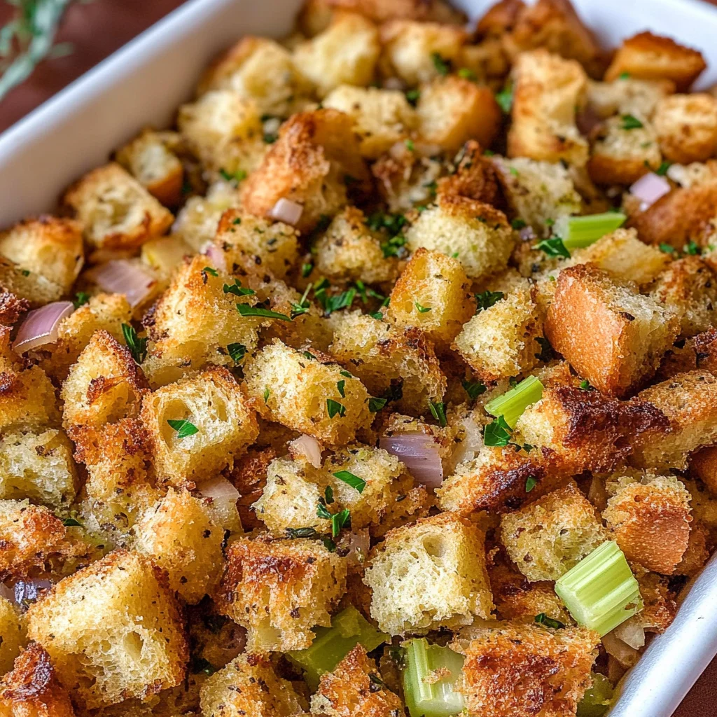Grandma’s Thanksgiving Stuffing Recipe is a heartwarming dish that captures the essence of holiday gatherings. This comforting stuffing blends the rich flavors of sautéed onion and celery with a medley of aromatic herbs, enveloping tender bread cubes in a savory embrace. Perfectly moist yet delightfully chewy, this stuffing is a true crowd-pleaser that evokes memories of family traditions and laughter around the table.